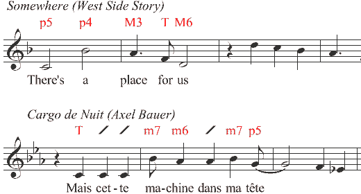 I have transposed them both so that the interval starts on C. The innocent hopeful yearning of the +10 in the first song is as distant as you can get from the pent-up sexual frustration of the same move in the second. (If you don’t know Axel Bauer’s song Cargo de Nuit you can find the excellent video on youTube.) In one of my previous posts (What’s in that Sandwich?) I remarked on the subjective difference between two +8 moves, where one was a minor sixth, and the other an augmented fifth. But here both intervals have the same classical ID of minor seventh. They do however sit in different relations to their respective tonics, as you can see here: