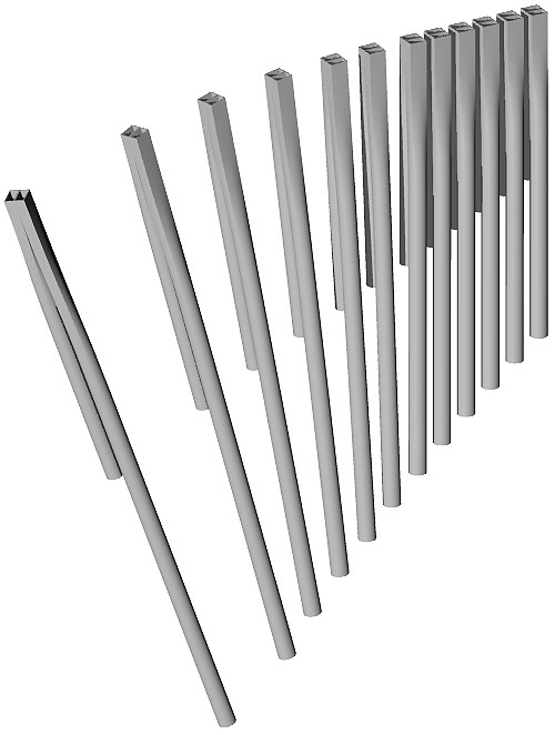 This allowed me the option of placing the upper or lower octave facing me. So a chromatic set of twelve octave pairs provides a usable range of two octaves. The tube further away from the player receives less air and gives just enough support to its octave partner for a beefy sound.